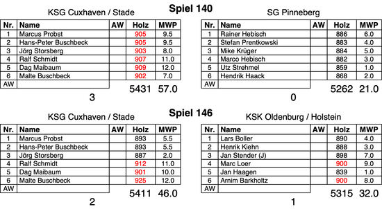 In der Partie am Sonnabend konnte sich die KSG deutlich mit 5431:5262 Holz und einem 57:21 in der Unterwertung durchsetzen. Die Startachse, bestehend aus Hans-Peter Buschbeck und Marcus Probst, legte mit jeweils 905 Holz den Grundstein für den Erfolg. Die Mittelachse baute den Vorsprung weiter aus, und die Schlussachse um Dag Maibaum und Malte Buschbeck spielte den Sieg souverän nach Hause. Maibaum spielte den Tagesbestwert mit 909 Holz. Malte Buschbeck erzielte mit 902 Holz auch das sechste Ergebnis über 900 Holz der Heimmannschaft - und sorgte damit für einen neuen Mannschaftsbahnrekord.