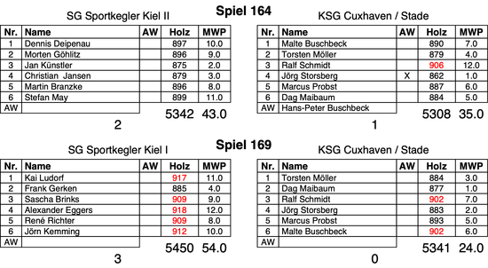 Die Schlussachse mit Marcus Probst ( 887) und Dag Maibaum (884) musste jetzt nur die Ergebnisse der Kieler Mittelachse übertreffen und der Zusatzpunkt war sicher. Beide überspielten die Kieler Mittelachse uns war es auch nicht schlimm, das Martin Branzke (896) und Stefan May (899) Klar besser waren.