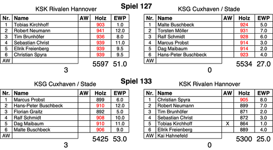 (1) Es war schon nach dem Einspielen klar, dass sehr hohe Ergebnisse der KSGer benötigt werden, um den Zusatzpunkt angreifen zu können. Die Startachse mit einem hervorragend aufgelegten Torsten Möller (931) und Malte Buschbeck (924) verlor nur gegen Robert Neumann (941). Tobias Kirchhoff (903) konnte da nicht mithalten. Dann allerdings brannten die Rivalen ein Feuerwerk ab. In der Mittelachse mit der sehr guten Leistung von Ralf Schmidt (928) und Marcus Probst (914), war aber auch kein Herankommen an Tim Brunhöfer (936) und Sebastian Christ (939). Die Schlussachse mit Dag Maibaum (914) und Hans-Peter Buschbeck (923) konnte auch keine Wende mehr herbeiführen. Da Ellrik Freienberg (939) und Christian Spyra (939) einsam ihre Kreise zogen, blieb auch der Zusatzpunkt in Hannover. Kuriosum am Rande: Gleich drei Hannoveraner spielte 939 Holz.