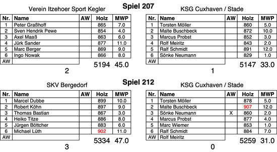 Die Schlussachse musste jetzt wieder ein hohes Ergebnis erzielen, um den Zusatzpunkt zu ergattern. Doch an diesem Spieltag klappte es nicht. Marc Wiemer (853) kämpfte hier gegen jürgen Bötcher (883) und Ralf Schmidt (884) gegen den besten Bergedorfer Michael Lüth (902). Ralf Schmidt hätte drei Holz mehr für den Zusatzpunkt benötigt.