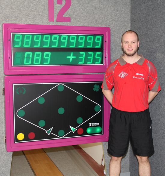 Den Höhepunkt des Sonntags setzte Malte Buschbeck, der nach elf Bahnen und 110 Wurf weit von den 90 Plushölzern, der bisherigen Bestmarke von Antje Sandrock-Semmler, entfernt war. Ihm gelang zum ersten Mal in einem Wettbewerb das Kunststück einer 89er-Serie (siehe Bild) und damit das Rekordergebnis des Wochenendes mit 931 Holz. Die Konkurrenten auf den Nachbarbahnen unterbrachen zeitweise ihren eigenen Wettbewerb, um Maltes Endspurt zu verfolgen. Die 335 Holz im Bild rechts markieren das Endergebnis der siegreichen Herrenmannschaft der Cuxhavener Sportkegler-Vereinigung. Ausführlicher Bericht folgt.