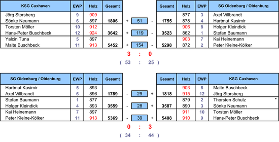 Am Sonntag sollte dann noch der ein oder andere Pluspunkt im Rückspiel für die KSG auf den Oldenburger Bahnen angestrebt werden, zeigten die Hausherren sich auf ihren Bahnen doch bisher als anfällig. Dazu muss man auf fremden Bahnen allerdings erst einmal zurecht kommen, was Malte Buschbeck (903) und Jörg Storsberg (915) als Spielbester eindrucksvoll gegen 893+896 Holz der Oldenburger gelang. Auch Thorsten Schulz / Florian Graitz (879) und Sönke Neumann (890) ließen den Oldenburgern (877+893) keine Chance das Spiel noch zu drehen, bevor Torsten Möller (911) und Hans-Peter Buschbeck (910) gegen die starke Oldenburger Schlußkette Kai Heinemann (897) und Peter Kleine-Völker (913) sprichwörtlich den Sack zu machten.