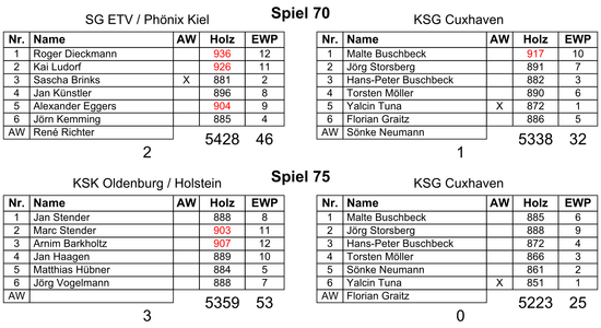 Die Hausherren setzten die Cuxhavener mit Roger Die kmann (936) und Kai Ludorf (926) gleich mächtig unter Druck. So gaben Malte Buschbeck (917) und Jörg Storsberg (891) auch gleich 54 Holz ab, doch mit ihren guten Resultaten eröffneten sie den spannenden Kampf um den dritten Spielpunkt. Die Mittelachse war recht ausgeglichen und die Kieler konnten gegen Hans-Peter Buschbeck (882) und Torsten Möller (890) nur fünf Holz gut machen, wobei die Cuxhavener weitere wichtige Einzelwertungspunkte errangen. Auch die Schlusskegler Yalcin Tuna (872) und Florian Graitz(886) konnten dem Spiel keine Wendung mehr geben, doch das eine Holz, dass Florian dem Kieler Kemming abrang, brachte der KSG den erhofften Auswärtspunkt.