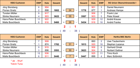 Gleich in der Startachse mußten die Hausherren auswechseln und gerieten ungewohnterweise auf eigenen Bahnen in einen Rückstand, den sie bis Spielende nur auf knappe fünf Holz verringern konnten. Jörg Storsberg (908) und Florian Graitz / Yalcin Tuna (874) gaben gegen U.Taubenheim (893) und S.Lazarus (920) über dreißig Holz ab. Lazarus erzielte dabei allein 34 Holz in 30 Wurf auf der Bahn eins. Torsten Möller (915) und Sönke Neumann (898) verloren danach weiteren Boden an G.Omak (906) und N.Gattner (904). In der Schlußachse wurde es noch einmal spannend, denn Vater und Sohn Buschbeck gaben natürlich alles, um die drohende Niederlage abzuwenden. Die Berliner T.Koch (925) und M. Süßmilch (899) setzten allerdings die Meßlatte an diesem Tage zu hoch und knöpften der KSG trotz des Bahnrekordes von Hans-Peter Buschbeck mit 936 Holz, Malte erzielte 911 Holz, alle drei Spielpunkte ab.
