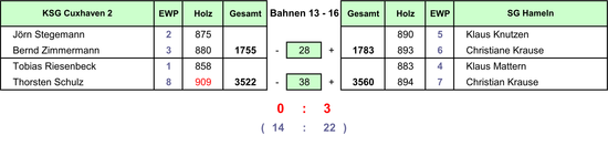 Die Cuxhavener spielten gegen Hameln weitestgehend unter ihren Möglichkeiten, nur Thorsten Schulz zeigte an diesem Tag wieder einmal seine gewohnt gute Form. Mit 909 Holz als Tagesbester der Liga an diesem Tag konnte er am Ausgang des Spiels allerdings nichts mehr ändern, der Rückstand nach Jörn Stegemann (875), Bernd Zimmermann (880) und Tobias Riesenbeck war schon zu groß. So nahm diese Spielserie nicht das gewünschte positive Ende, doch das Team hat die Saison abgehakt und wird ab Herbst erneut angreifen.