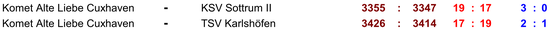 In der Herrenbezirksklasse gewannen die Cuxhavener Sportkegler von Komet Alte Liebe gegen Sottrum II und Karlshöfen fünf Punkte. Mit neun erzielten Punkten in der Tabelle reichte es zum elften Platz....