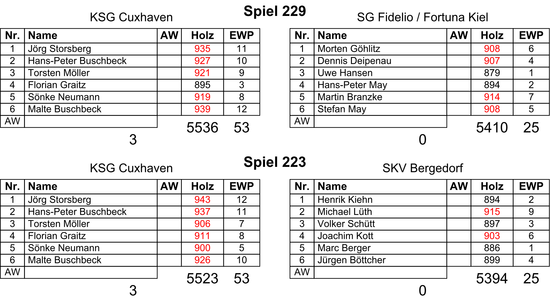 Am Sonntag gelang dem Heimteam dann noch eine Leistungssteigerung und schickte die Fördestädter mit einer ebenso deutlichen Niederlage nach Hause wie am Vortag die Bergedorfer. Jörg Storsberg war in seinem 550. Bundesligaspiel erneut auf Rekordjagd, blieb diesmal aber auf 935 Holz hängen. Mit Hans-Peter Buschbeck (927) setzte sich die Startachse diesmal gegen M.Göhlitz (908) und D.Deipenau (907) erneut sicher in Führung die Torsten Möller (921) und Florian Graitz (895) sicher ausbauten. Sönke Neumann (919) und Malte Buschbeck (939) setzten dann gegen M.Branzke (914) und S.May (908) die Schlusspunkte unter ein äußerst erfolgreiches Wochenende.