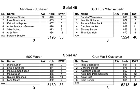 Für einen Tabellenletzten ohne bisherige Pluspunkte spielte das Müritz-Team an diesem Tage nicht auf. In ihrem ersten Spiel des Tages brachten sie schon die Bremerhavenerinnen in arge Bedrängnis und auch gegen Grün-Weiß gelang ihnen eine vorübergehende Führung. Imke Buschbeck (861) und Christine Müller (875) gaben an D.Kotjan (875) und L.Feutlinski (871) zehn Holz ab. In der Mittelachse dann die Wendung im Spiel, die Katharina Sepcke (853) und Antje Sandrock-Semmler (882) gegen M.Senftleben (850) und M.Boos (856) gelang. Anja Fürst (877) und Silke Schulz (865) mussten aber noch einmal konzentriert zu Werke gehen, um den Sieg gegen C.Spohnholz (876) und I.Müsch (852) klar zu machen.