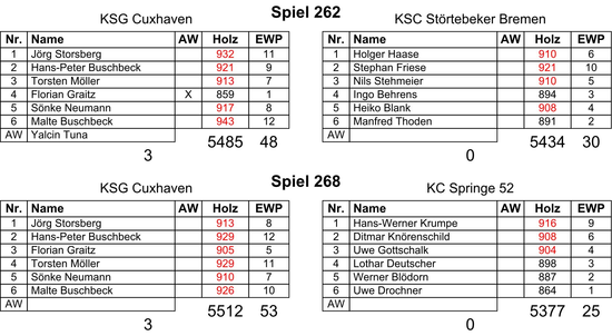 Mit dem Glück des Tüchtigen und konzentrierten Leistungen bis zum letzten Wurf bezwangen die Hausherren die Bremer, die mit H.Haase (910) und S.Friese (921) in der Startachse mächtig Druck machten. Jörg Storsberg und Hans-Peter Buschbeck lagen zwischenzeitlich im Hintertreffen, doch sie ließen sich nicht beirren und wehrten die Angriffe mit 932 und 921 Holz gut ab. In der Mittelachse begann dann das große Zittern, denn die Gäste gaben mit N.Stehmeier (910) und I.Behrens (894) weiter Gas, während Florian Graitz schwächelte und auch der Einwechselspieler Yalcin Tuna keine Steigerung brachte, 859 Holz war das magere Resultat. Stark dagegen das Auftreten von Torsten Möller, der mit seinen 913 Holz gleich zwei Bremer Ergebnisse eliminierte, so dass trotz des zwischenzeitlichen Rückstandes von zehn Holz doch noch ein Drei-Punkte Sieg möglich war. Während nun in der Schlussachse die Hansestädter mit H.Blank (908) und M.Thoden (891) ihre sehr gute Mannschaftsleistung komplettierten, drehten die Cuxhavener noch einmal mächtig auf. Sönke Neumann spielte gute 917 Holz und Malte Buschbeck setzte mit 943 Holz, also erneut ein Ergebnis über 100 Plus-Hölzern, den Schlusspunkt des wichtigen Heimsieges.