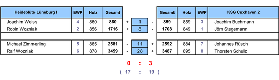 Joachim Buchmann (859) und Jörn Stegemann (849) ließen ihren Lüneburger Konkurrenten nur einen kleinen Vorsprung von acht Holz. Nach Johannes Rüsch (884) kippte dann das Spiel zugunsten der KSG, die mit Thorsten Schulz noch den besten Spieler der Liga im Aufgebot hatten. Mit dem Tageshöchstergebnis aller zwölf Teams, 895 Holz, sicherte Thorsten der Mannschaft einen Dreipunkte-Sieg, die Vizemeisterschaft und sich selbst Rang eins in der Einzelwertung.