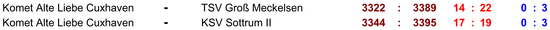 In der Herren Bezirksklasse verloren die Cuxhavener Sportkegler von Komet Alte Liebe gleich beide Sonntagsspiele mit je 0:3 gegen den Tabellenführer TSV Groß Meckelsen und den KSV Sottrum II. Somit rutschte...