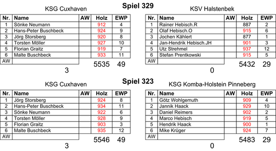 Das junge Gästeteam zeigte von Beginn an sehr gute Leistungen durch G.Wohlgemuth (909) und J.Haack (929), doch Jörg Storsberg (924) und Hans-Peter Buschbeck (934) zogen ihren Stiefel durch und brachten die KSG mit 20 Holz in Führung. Neun Holz packten Sönke Neumann (922) und Torsten Möller (928) gegen D.Reimers (902) und M.Hebisch (919) dann oben drauf und Florian Graitz (903) sowie Malte Buschbeck (935) erhöhten gegen H.Haack (900) und M.Krüger (924) noch einmal um 14 Holz. Nach dem Spiel konnten die Cuxhavener dann nicht nur sich zu der tollen Mannschaftsleistung gratulieren, sondern auch den Gästen zur fest stehenden Meisterschaft. Ob die Pinneberger allerdings den Gang in die 1.Bundesliga antreten, steht noch nicht fest.
