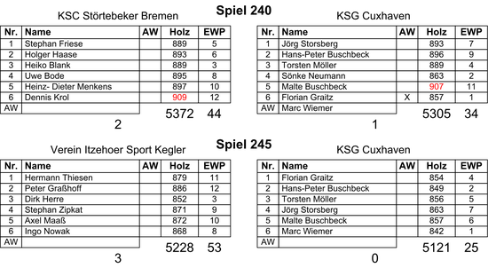 Das Samstagsspiel in Bremen begann recht verheißungsvoll für die KSGer, die durch Jörg Storsberg (893) und Hans-Peter Buschbeck (896) mit sieben Holz gegen S.Friese (889) und H.Haase (893) in Führung gingen. Nach Torsten Möller (889) und S.Neumann (863) gegen H.Blank (889) und U.Bode (895) drehte sich allerding das Spiel, das die Hausherren durch H.-D. Menkens (897) und D.Krol (909) gegen Malte Buschbeck (907) und Florian Graitz / Marc Wiemer (857) nicht mehr aus der Hand gaben. Vier gute Punktergebnisse in der Einzelwertung bescherten den Cuxhavener aber verdient den dritten Spielpunkt.