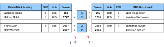 Die KSG II Cuxhaven lag zu diesem Zeitpunkt mit nur zwei Holz im Hintertreffen und verpasste die Gelegenheit, durch Spitzenspieler Thorsten Schulz noch Platz drei in der Abschlusstabelle zu erreichen. Dies war aber an diesem Tage nebensächlich und die Cuxhavener können mit Platz sechs bei 18:15 Punkten zufrieden sein. Gegen Heideblüte Lüneburg I gab es nach Jörn Stegemann (869), Joachim Buchmann (865) und Johannes Rüsch (870) folgende Wertung: