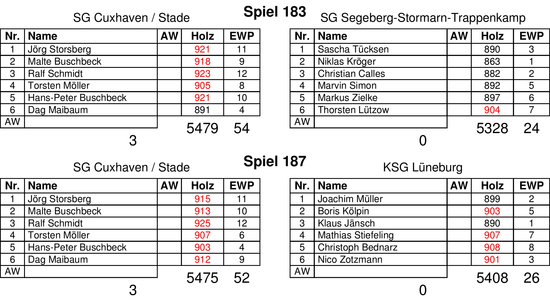 Eine geschlossen gute Mannschaftsleistung reichte den Lüneburgern am Sonntag nicht, um die KSGer in Verlegenheit zu bringen. Da auch bei Dag Maibaum endlich der Knoten geplatzt war, überstiegen alle Einzelergebnisse der Cuxhavener und Stader die 900er Marke, angeführt von Ralf Schmidt, der an diesem Wochenende als Spielbester 24 Einzelwertungspunkte für sich verbuchen konnte. Jörg Storsberg (915) und Malte Buschbeck (913) machten gegen J.Müller (899) und B.Kölpin (903) den Auftakt und nach Ralf Schmidt (925) und Torsten Möller (907) gegen K.Jänsch (890) und M.Stiefeling (907) war das Spiel schon entschieden. Für eine Resultatsverbesserung reichte es dann auch nicht für C.Bednarz (908) und N.Zotzmann (901), die Hans-Peter Buschbeck (903) und Dag Maibaum (912) nicht in Bedrängnis bringen konnten.
