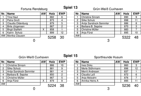 Wieder waren es Christine Sinram (886) und Silke Schulz (881), die ihr Team gegen I.Dierks (860) und M.Stöhrmann (896) mit elf Holz in Führung brachte. Die Mittelachse war dann sehr ausgeglichen, hier holten Antje Sandrock-Semmler (861) und Barbara Sepcke (850) gegen M.Andresen (837) und C.Laß (872) noch zwei Holz. Den spannenden Endspurt entschieden dann allerdings die Husumerinnen mit A.Molzahn (876) und A.Heins (895) für sich, die Christine Müller (867) und Anja Fürst (879) ganze 25 Holz abnehmen konnten.