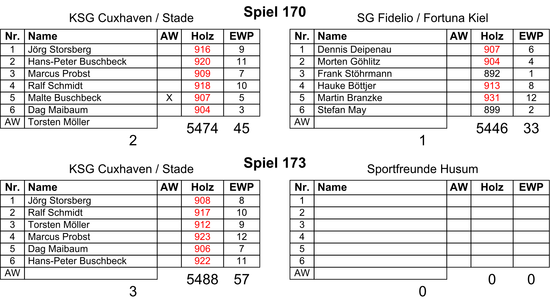 Die Schlussachse brachte dann jedoch die Wende. Malte Buschbeck musste nach elf Würfen verletzungsbedingt gegen Torsten Möller (907) ausgewechselt werden. Dieser hatte anschließend Schwierigkeiten, während Branzke eine Neun der anderen folgen ließ. Er erzielte beeindruckende 931 Holz. Auch Dag Maibaum tat sich zunächst schwer und lag zur Halbzeit deutlich hinter May zurück. Am Ende gewann er noch mit 904:899, doch da beide Kieler in der Startachse 904 und 907 gespielt hatten, hätten sowohl Torsten Möller als auch Dag Maibaum ein Holz mehr spielen müssen. Somit konnten die Kieler einen überraschenden Auswärtspunkt holen und die Heimmannschaft war bedient.
