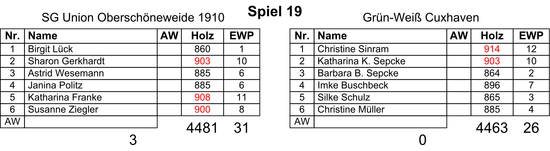 Der Auftakt begann für die Cuxhavener Damen vielversprechend. Die Startachse mit Christine Sinram (918) und Katharina Sepcke (903) nahmen ihren Gegenerinnen Birgit Lück (860) und Sharon Gerkhardt (903) bereits 54 Hölzer ab. Hierbei erzielte Christine Sinram mit ihrem fantastischen Spielergebnis das absolute Tageshöchstholz. Die Mittelachse mit Imke Buschbeck (896) und Barbara Sepcke (864) kämpften gegen die gleich starken Spielerinnen von Oberschöneweide Astrid Wesemann (885) und Nina Politz (885) und gaben dabei 14 Hölzer ab. Somit startete die Schlussachse um Silke Schulz (865) und Christine Müller (885) mit einem an sich beruhigenden Vorsprung von 40 Hölzer. Die Damen von Oberschöneweide Katharina Franke (908) und Susanne Ziegler (900) fanden von Beginn an besser in die Partie und drehten das Spielergebnis um 180 Grad. Während Christine Müller mit 885 Holz noch im Soll war, bot Silke Schulz mit 865 eine „schlechte Leistung“, wie sie selbst eingestand. Selbst eine nur knapp unterdurchschnittliche Leistung hätte für Cuxhaven der Sieg bedeutet. So gewann Oberschöneweide letztendlich mit 18 Holz das Spiel 3:0.