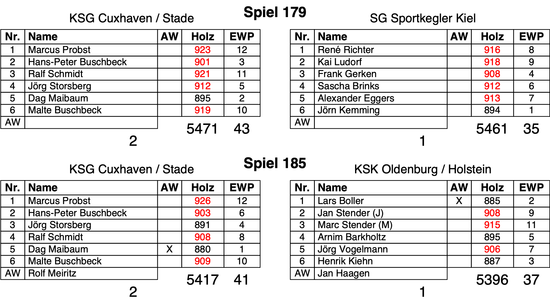 (1) Am Sonnabend gab es ein hervorragendes Bundesligaspiel der KSG gegen den amtierenden Deutschen Meister aus Kiel zu bestaunen. In der Startachse war erwartbar, dass Marcus Probst (KSG) und Kai Ludorf (Kiel) sich ein heißes Duell um das Topergebnis liefern werden. Doch auch der Kieler Rene Richter spielte von Anfang an hervorragend mit. Marcus Probst gewann die Startachse mit grandiosen 923 Holz vor Kai Ludorf (918) und Rene Richter (916). Da konnte der Cuxhavener Kapitän Hans-Peter Buschbeck mit 901 Holz nicht mithalten.