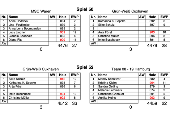 Die wieder allein für Cuxhaven spielende Anja Fürst (896) beendete ihr Spiel gegen Sandra Oetling (879) und Melanie Lammers (874). Damit betrug dann die Führung der Grün-Weißen vor der Schlussachse bereits 41 Holz. Routiniert und abgeklärt auf Seiten der Cuxhavenerinnen spielten Christine Müller (902) und Imke Buschbeck (904) diesen klaren Vorsprung nach Hause. Die Hamburgerinnen Christiane Gebauer (891) und Annika Heins (903) mussten nochmals zwölf Holz abgeben.