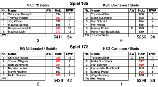 Damit musste die Schlussachse noch ein gutes Ergebnis für den Zusatzpunkt liefern. Dies schafften Jörg Storsberg (896) und Marcus Probst (908). Die Michendorfer Schlussachse mit Marko Friedrich (897) und Heiko Sandner (905) spielten zwar den Heimsieg ein, doch für die KSG Cuxhaven / Stade waren es 36 Einzelwertungspunkte und der erhoffte Zusatzpunkt.