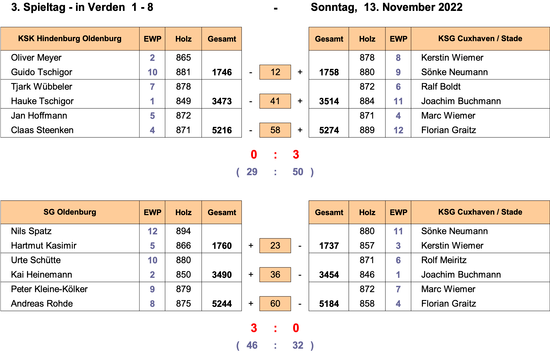 (1) Die Startachse mit Kerstin Wiemer (878) und Sönke Neumann (880) ging gleich mit zwölf Holz in Führung. Die Mittelachse mit den gerade erst wiedergenesenen Ralf Boldt (872) und Landesauswahlspieler Joachim Buchmann (884) holten weitere 29 Holz. Die Schlusssachse ging mit einem beruhigenden Vorsprung von 41 Holz auf die Verdener Bahnen. Die Schlussspieler der KSG Marc Wiemer (871) und der Spielbeste Florian Graitz (889) gaben sich keine Blöße. So gewannen die KSGer am Ende deutlich mit 58 Holz und zogen in der Tabelle an Hindenburg Oldenburg vorbei.