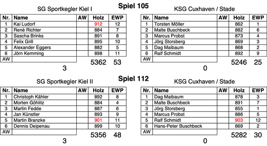 Die Schlussachse mit Hans-Peter Buschbeck (869) und Ralf Schmidt (903) sollte es jetzt richten. Schmidt spielte zwar hervorragend und konnte auch Martin Branzke (901) und Dennis Deipenau (899) übertreffen. Er sicherte sich die 12 Einzelwertungspunkte des Tagesbesten, doch da Branzke und Deipenau das Ergebnis von Malte Buschbeck übertrafen, blieb der Zusatzpunkt in Kiel.