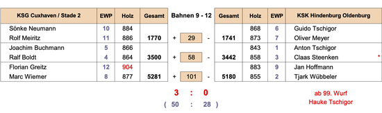 (1) Startspieler Sönke Neumann (884) brachte gegen Guido Tschigor (868) eine 16-Holz-Führung mit. Rolf Meiritz (886) konnte gegen Oliver Meyer (873) weitere 13 Holz drauflegen. Auch Joachim Buchmann (866) spielte nochmal gegen Anton Tschigor (843) 23 Holz ein. Ralf Boldt (864) hatte lange zu kämpfen, um Claas Steenken / Hauke Tschigor (858) niederzukämpfen.