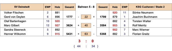 (1) Wie schon in der vergangenen Saison gab es gegen die Deinstedter eine Niederlage. Die Startachse mit Joachim Buchmann (879) und einem hervorragend aufgelegten Sönke Neumann (920) brachte eine 23 Holz Führung mit.