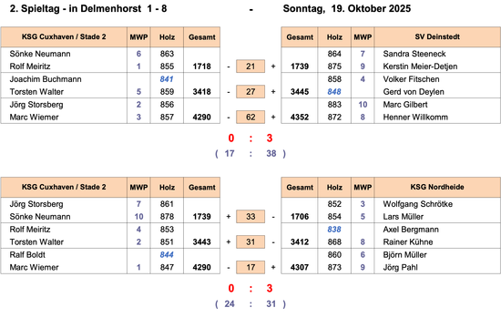 Die Schlussspieler der KSG, Marc Wiemer (857) und Jörg Storsberg (856), passten sich den Ergebnissen der KSGer an diesem Tag an, doch gegen die Deinstedter Top-Spieler Marc Gilbert (883) und Henner Willkomm (872) reichte das nicht.