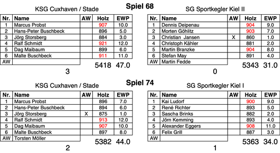 Gegen Sportkegler Kiel II waren die Cuxhavener von Beginn an im Spiel und überzeugten auf allen Positionen. Die mit Abstand beste Leistung zeigte Ralf Schmidt, der auf stolze 921 Holz kam. Ihm am nächsten kamen noch Malte Buschbeck (911) und Marcus Probst (907). Doch auch die Leistungen von Dag Maibaum (899), Hans-Peter Buschbeck (896) und Jörg Storsberg (884) konnten sich sehen lassen. Am Ende stand ein verdienter 3:0 (5418:5343)-Sieg.