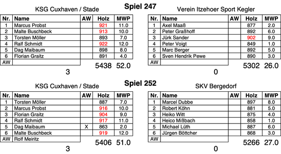 Die Mittelachse mit Torsten Möller (893) und dem Spielbesten Ralf Schmidt (922) holte weiter Holz gegen Jürk Sander (902) und Peter Voigt (849). Damit war der Sieg bereits sicher.