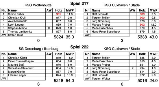 Die Schlussachse musste jetzt den Vorsprung verteidigen. Hans-Peter Buschbeck (879) und Malte Buschbeck (879) taten sich schwer. Doch letztendlich war das egal, da nur Thomas Janitschke (897) ein höheres Ergebnis erzielte. Wolfenbüttel versuchte noch alles und wechselte Stephan Meine gegen Stefan Rust (873), doch die Buschbecks brachten 14 Holz ins Ziel.
