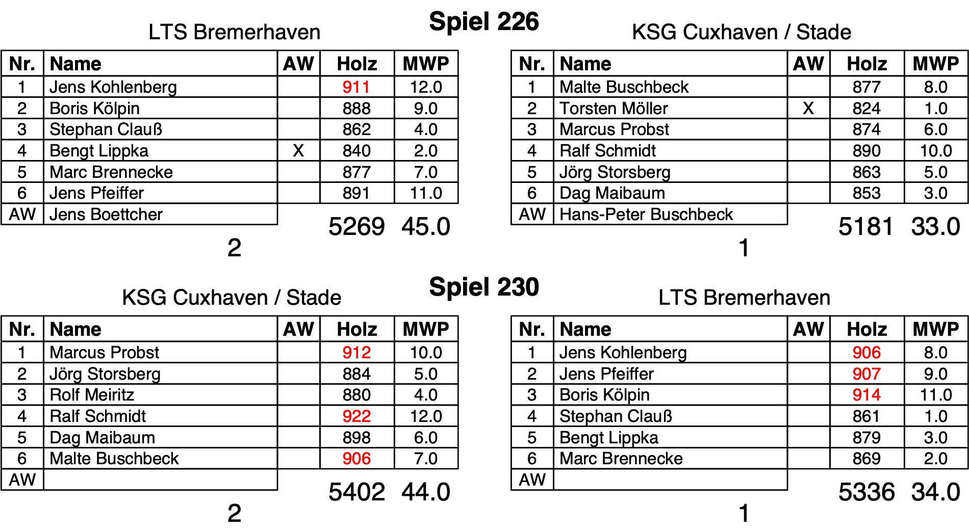 Die Startachse mit einem nicht gut aufgelegten Torsten Möller (824),der nach 30 Wurf gegen Hans-Peter Buschbeck ausgewechselt wurde und Malte Buschbeck (877) hatte gar nichts zu bestellen gegen den Spielbesten Jens Kohlenberg (911) und Boris Kölpin (888). Noch schlimmer war, das der eingewechselte Hans-Peter Buschbeck nach zehn Kugeln eine Zerrung erlitt und damit nur noch eingeschränkt spielen konnte.