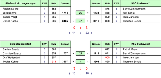 In der ersten Partie gingen die Cuxhavener mit Bernd Zimmermann (876) und Rolf Schütt (858) mit 20 Holz in Führung. Den zweiten Saisonsieg sicherten dann mit guten Resultaten Imke Janssen (890) und Thorsten Schulz (888).