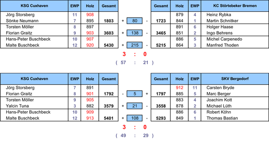 Gastmannschaften haben damit aber mehr oder weniger große Probleme, die Bahnen richtig und schnell „zu lesen“ und den entsprechenden Wurf auch zu halten. So erging es dann wunschgemäß den Bremern, die mit nur 21 Zusatzpunkten die größtmögliche Niederlage hinnehmen mussten. 21 Zusatzpunkte bedeutet, dass selbst der beste Gastspieler, hier Holger Haase mit 891 Holz, nicht das niedrigste KSG-Ergebnis erreichen konnte. Mit einer kompakten Mannschaftsleistung, Jörg Storsberg (908), Sönke Neumann (895), Torsten Möller (897), Florian Graitz (903), Hans-Peter Buschbeck (907) und Malte Buschbeck (920) trumpften die Cuxhavener auf und waren damit gut gerüstet für die vermeintlich schwerere Aufgabe am Sonntag.