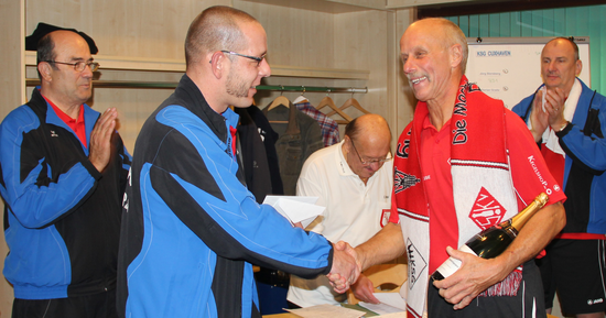 Es gab an diesem Tag aber auch noch ein anderes, selteneres Ereignis zu feiern denn „Buschi“ absolvierte an diesem Sonntag sein 500. Bundesligaspiel. Dieser weitere Meilenstein in seiner in Cuxhaven einzigartigen Kegellaufbahn war natürlich Grund genug für zahlreiche Glückwünsche und Präsente. Die Bergedorfer, Cuxhavener Fans und seine Mannschaftskameraden ließen den Jubilar dann bei einem kleinen Umtrunk mit dem Keglergruß, einem dreifachen kräftigen „Gut Holz“, hochleben.