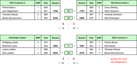 Auf den Winsener Kegelbahnen gab es gegen den TSV Bremervörde II und das Team aus Uelzen jeweils eine 0:3 Niederlage bei einem deutlichen 14:22 in der Zusatzpunktewertung. Zum Einsatz für die Cuxhavener kamen Patrick Braun (849+865), Jörn Stegemann (851), Rolf Schütt (832), Bernd Zimmermann (855+829) sowie Thorsten Schulz (880+844).