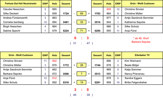 Im ersten Spiel gegen Neumünster ging die Startachse mit Christine Müller (884 Holz) und Christine Sinram (909) gleich in Führung und nahm ihren Gegnerinnen 69 Holz ab. In der Mittelachse schwächelten Antje Sandrock-Semmler (877) und Katharina Sepcke, die ab dem 48. Wurf gegen Barbara Sepcke (872) ausgewechselt wurde, und gaben 36 Holz an die Neumünsteraner ab. Doch die souverän spielenden Silke Schulz (886) und Anja Fürst (895) ließen ihren Gegnerinnen keine Chance und bauten den Vorsprung um 38 Holz aus. Der Sieg ging mit 71 Plushölzern und 3:0 Punkten verdient an die Grün-Weißen.