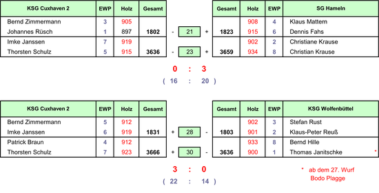 Wie schon so oft mussten die Cuxhavener auch hier einem frühen Rückstand hinterher laufen, der trotz starker Gegenwehr nicht mehr ausgegleichen werden konnte. Der Hamelner Christian Krause war mit 934 Holz an diesem Tag einfach nicht zu toppen und so musste im zweiten Spiel ein Sieg über den Tabellendritten Wolfenbüttel her.