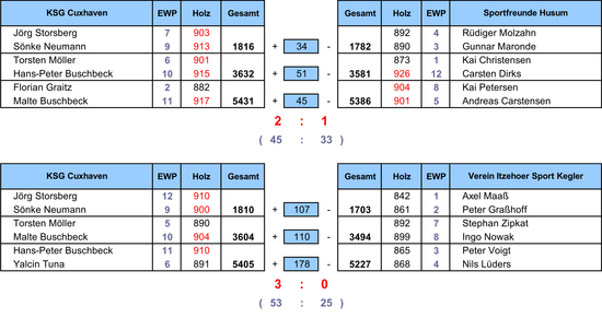 Mit einer bis auf eine Ausnahme geschlossenen Mannschaftsleistung warteten die Hausherren am Sonnabend gegen die Gäste aus Husum auf und doch fehlte das ein oder andere Holz, um in der Einzelwertung die nötigen Zähler für den dritten Spielpunkt zu sammeln. Hinzu kommt, dass der Husumer Carsten Dierks mit 926 Holz als Spielbester 12 Punkte notierte, womit die Partie, die die Cuxhavener ansonsten gut im Griff hatten, mit 2:1 Punkten endete. Jörg Storsberg´(903) und Sönke Neumann (913) brachten ihr Team in Führung, die Torsten Möller (901) und Hans-Peter Buschbeck (915) weiter ausbauten. In der Schlusskette dann die Entscheidung durch Florian Graitz (882) und Malte Buschbeck (917), die zusehen mussten, wie sich die Husumer mit 904 und 901 noch hoch in die Punkte spielten.