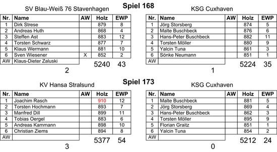 Für das Spiel am Sonnabend hatten sich die Gäste nicht viel vorgenommen denn der Gastgeber hatte im bisherigen Saisonverlauf Heimstärke bewiesen. Jörg Storsberg (874) und Malte Buschbeck (876) brachten die KSG allerdings mit drei Holz in Führung die Hans-Peter Buschbeck (882) und Torsten Möller (880) auf fünf Holz ausbauten. Der dritte Spielpunkt war damit schon so gut wie sicher auf Cuxhavener Seite, doch zum Sieg sollte es nicht reichen. Yalcin Tuna (861) und Sönke Neumann (851) kamen auf den wenig ergiebigen Bahnen nicht zurecht und Stavenhagen rettete glücklich den Sieg.