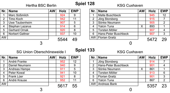 Da es beim Tabellenführer von vornherein nichts zu holen gab, wurde Malte Buschbeck geschont, so dass der komplette Kader in Berlin zum Einsatz kam. Hier verhinderte der spielbeste Cuxhavener Jörg Storsberg mit 914 Holz noch die Höchststrafe eines 57:21 in den Einzelwertungspunkten. Mit ihm erhielten Hans-Peter Buschbeck (901), Sönke Neumann / Andreas Bank (861), Torsten Möller (913), Florian Graitz (901) und Yalcin Tuna (867) eine Kegeldemonstration der Gastgebers, die mit Ergebnissen zwischen 911 und 952 Holz glänzten.