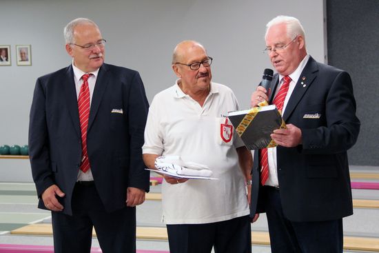 Vor der offiziellen Siegerehrung erhielt der Cuxhavener Kegler und Schiedsrichter Eduard Härtel (Foto, Mitte) vom DBKV-Präsidenten Ketelhake eine besondere Ehrung überreicht. Für seine 100. Wiederholung des Kegelleistungsabzeichens des Kegel-Verbandes Niedersachsen erhielt „Edu“ eine Ehrennadel nebst Urkunde und ein Buchgeschenk.
