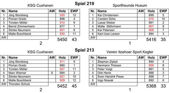 Für den Sonntag mobilisierte Malte Buschbeck nun die Reserve aus der 2. Mannschaft, um die als stärker einzuschätzenden Husumer zu bezwingen und es musste dazu trotz der Probleme ein ebenso gutes Mannschaftsergebnis erzielt werden, das war klar. Hochmotiviert legten Jörg Storsberg (930) und Florian Graitz (898) gegenüber dem Vortag eine kräftige Schippe drauf, was gegen K.Christensen (899) und C.Dierks (919) auch bitter nötig war. Torsten Möller (914) und Bernd Zimmermann (877) ließen dagegen das Spiel in Gästerichtung kippen, die mit L.Weber (891) und M.Stöhrmann (907) Boden gut machten. Nun war es an der Cuxhavener Schlußachse, dem Spiel noch eine positive Wendung zu geben. Sönke Neumann (901) und Malte Buschbeck (930) gelang dieses Vorhaben dann auch gegen K.Petersen (906) und K.-U.Larsen (894) und sicherten ihrem Team den wohlverdienten 2:1 Erfolg.