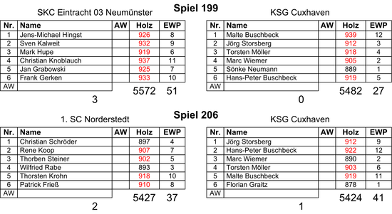 Trotz des hervorragenden Einzelergebnisses von Malte Buschbeck (939) waren die Cuxhavener am Sonnabend auf den Bahnen in Neumünster chancenlos, denn Jörg Storsberg (912), Torsten Möller (918), Marc Wiemer (905), Sönke Neumann (889) und Hans-Peter Buschbeck (919) blieben allesamt hinter den Ergebnissen der Gastgeber J-M. Hingst (926), S.Kalweit (932), M.Hupe (919), C.Knoblauch (937), J.Grabowski (925) und F.Gerken (933) zurück, so dass auch der erhoffte dritte Spielpunkt nicht erreicht werden konnte.