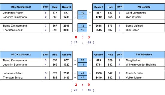 Die Partie gegen Bomlitz begann recht ausgeglichen, nach Johannes Rüsch (877) und Joachim Buchmann (862) lag das Team nur drei Holz zurück. Bernd Zimmermann (867) und Thorsten Schulz (893) gaben dann auch noch einige Hölzer ab, womit die Punkte an Bomlitz gingen.