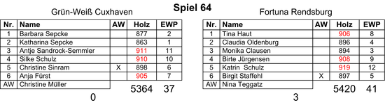 Der letzte Spieltag der Damen-Bundesliga zieht sich über fast fünf Stunden hin, da alle zwölf Mannschaften mit je einer Keglerin über alle Bahnen an den Start gehen. Schon nach zwei Starterinnen zeigte sich, dass die Rendsburgerinnen nicht gewillt waren, den dritten Tabellenplatz noch abzugeben, denn mit Tina Haut (906) und Claudia Oldenburg (896) nahmen sie den Grün-Weißen Barbara Sepcke (877) und Katharina Sepcke (863) gleich über 60 Holz ab. Nun nahm der Vizemeister allerdings Fahrt auf, doch die Fortunen hielten mit einer tollen Teamleistung dagegen und verkürzten mit einem verdienten Sieg den Abstand auf Grün-Weiß auf einen Punkt. Antje Sandrock-Semmler (911), Silke Schulz (910), Christine Sinram / Christine Müller (898) und Anja Fürst (905) konnten da gegen Monika Clausen (894), Birte Jürgensen (908), Katrin Schulz (919) und Birgit Staffehl / Nina Teggatz (897) nur für eine kleine Resultatsverbesserung sorgen.