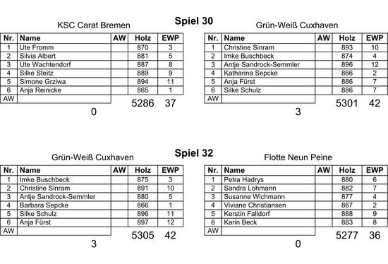 In der umkämpften Partie gegen Bremen gingen die Cuxhavenerinnen nach Christine Sinram (893) und Imke Buschbeck (874) gegen U.Fromm (870) und S.Albert (881) mit 16 Holz in Führung. Dieser Vorsprung schmolz dann in der Mittelachse beträchtlich, denn trotz der Bestleistung von Antje Sandrock-Semmler (896) und Katharina Sepcke (866) gingen 14 Holz an die Bremerinnen U.Wachtendorf (887) und S.Steitz (889). Mit Anja Fürst (886) und Silke Schulz (886) hat Grün-Weiß aber eine nervenstarke Schlussformation aufzubieten, eine Bank, wie man so schön sagt, und die beiden machten gegen S.Grziwa (894) und A.Reinicke (865) den ersten Tagessieg perfekt.