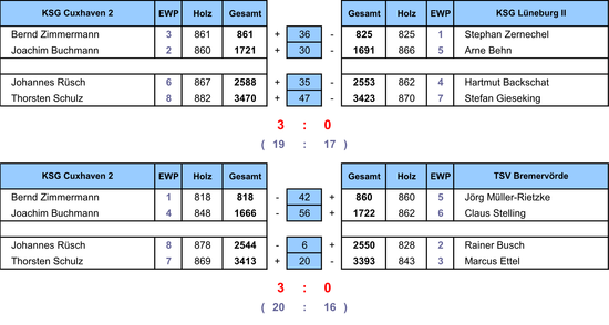 Mit einer kompakten Mannschaftsleistung, Bernd Zimmermann (861), Joachim Buchmann (860), Johannes Rüsch (867) und einem herausragenden Thorsten Schulz (882), war die Auftaktbegegnung gegen Lüneburg eine Pflichtaufgabe für die Cuxhavener, die auch in dieser Spielserie wieder oben mitmischen wollen.
